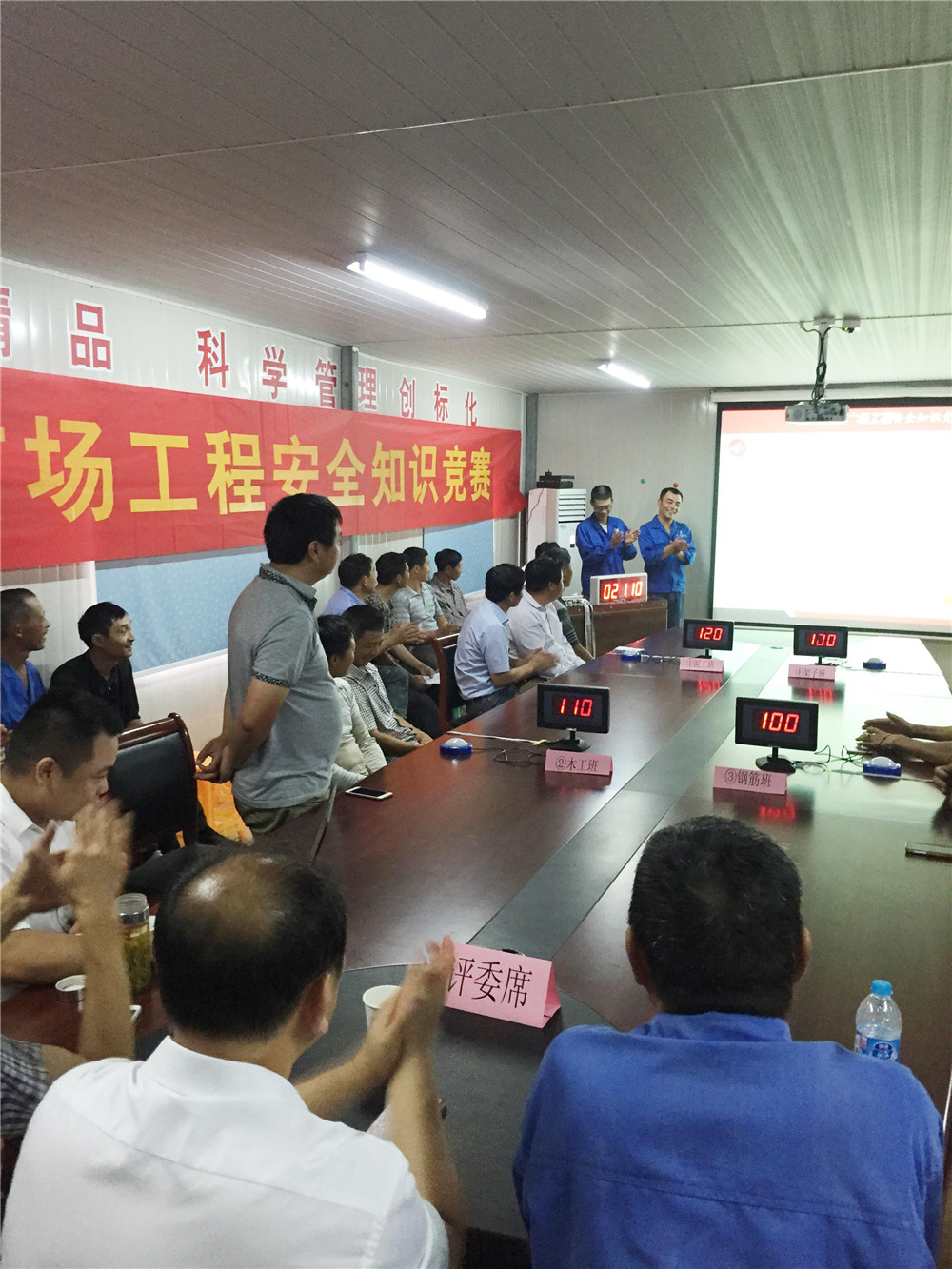 比賽的內容為必答題、行為題、搶答題和觀眾題四個部分。比賽中,各組選手你搶我答,毫不示弱。這次比賽的題目內容都是貼合工地實際的常識,是工人們在日常施工中需要掌握的基本知識。特別是行為題,讓參賽人員現場比賽如何正確戴好安全帽和如何正確帶好安全帶,通過這樣的行為題比賽不僅可以加深比賽選手對安全帽、安全帶使用原理的深刻理解,還可以教育其他人員的對安全帽、安全帶的使用方法。通過幾輪激烈的角逐,最后鋼筋工班組摘得桂冠。