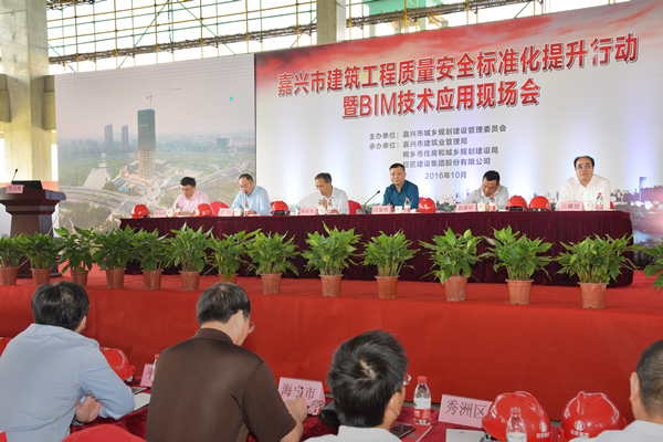 2016-10-12 嘉興市建筑工程質量安全標準化提升行動暨BIM技術應用現場會在我集團振石控股集團總部大樓項目部現場隆重召開 10月11日下午,由嘉興市建委主辦,我集團承辦的“嘉興市建筑工程質量安全標準化提升行動暨BIM技術應用現場會”在集團承建的振石控股集團總部大樓項目部現場隆重召開,來自全市五縣兩區的行業主管部門、施工...